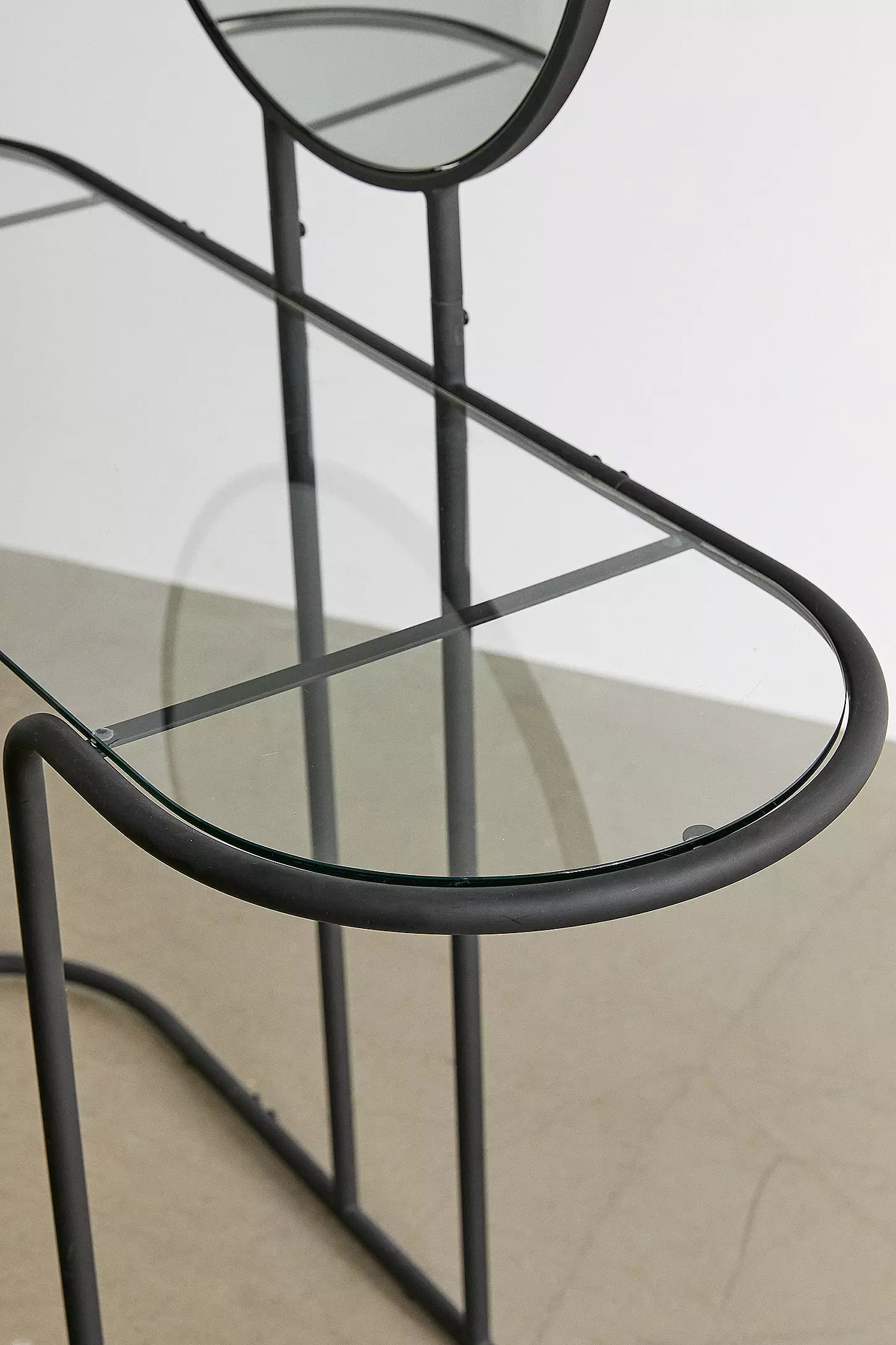 The Charlotte Console Table is a striking fusion of geometry and elegance, designed for those who appreciate furniture as a statement piece. Crafted with a sleek black steel frame, its fluid, continuous lines create a sculptural form that balances function with artistic presence. The circular mirror centerpiece adds depth and visual intrigue, while the elongated glass top provides a refined surface for décor or daily essentials.