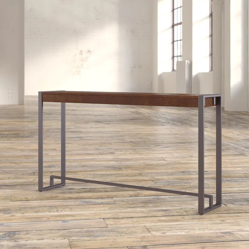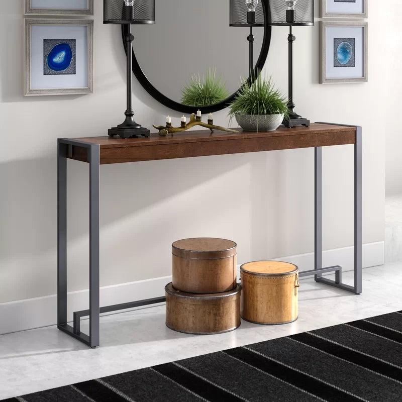 Make a bold statement in the entryway with this console table, a great place to set up a welcoming display. This narrow design features an understated frame crafted from iron and a solid and manufactured wood top that create a contrasting look in your space. A lower support bar offers both style and stability, while the top features plenty of space for you to spread out decorative accents, potted plants, lamps, and more.