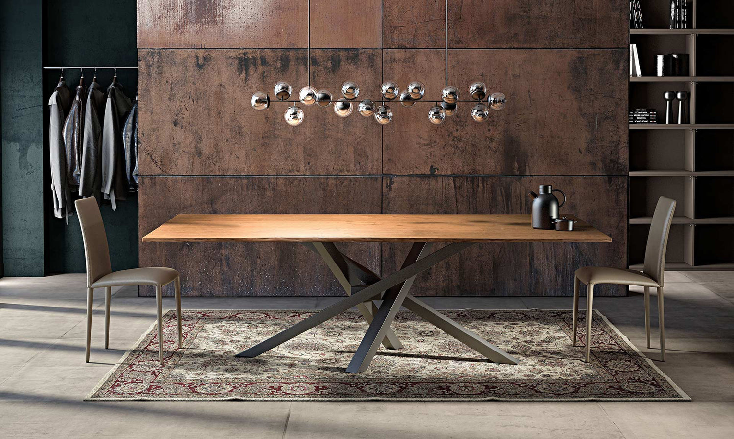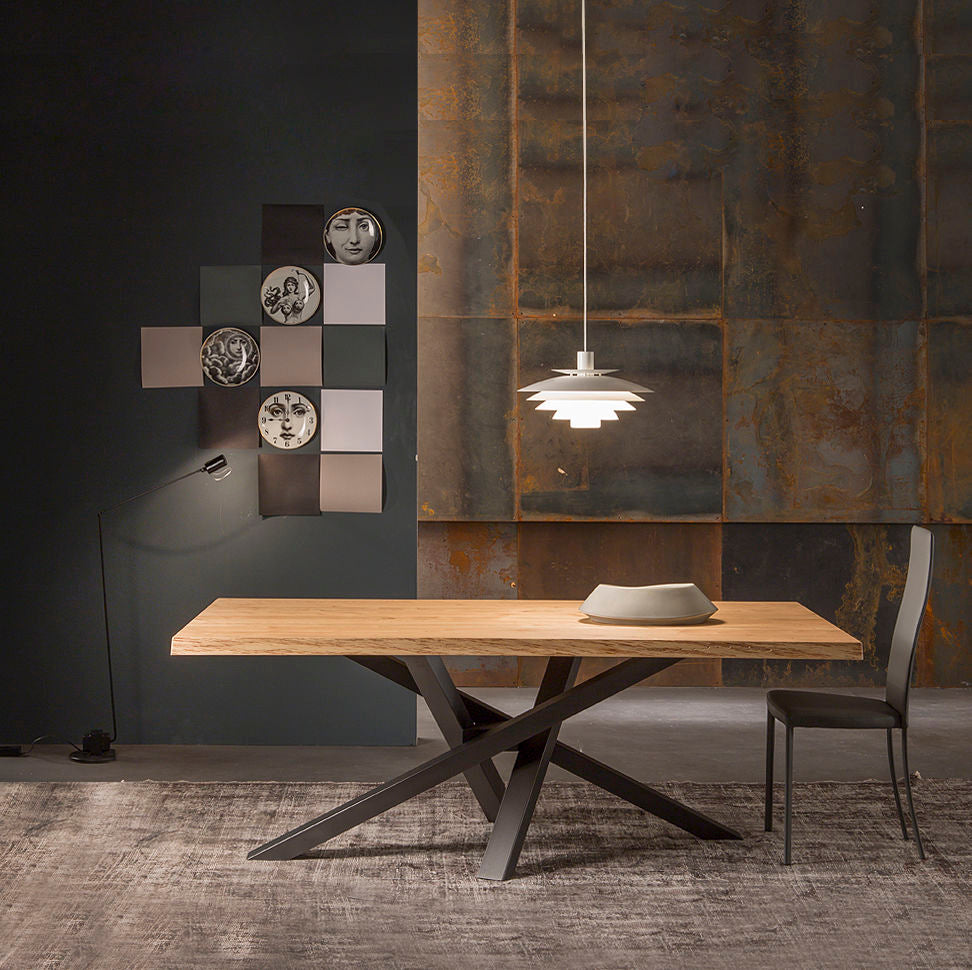 Collection SHANGAI with base characterized by oblique legs and stracked between them in an asymmetric way, with a central articulation, available in different measures and finishes.